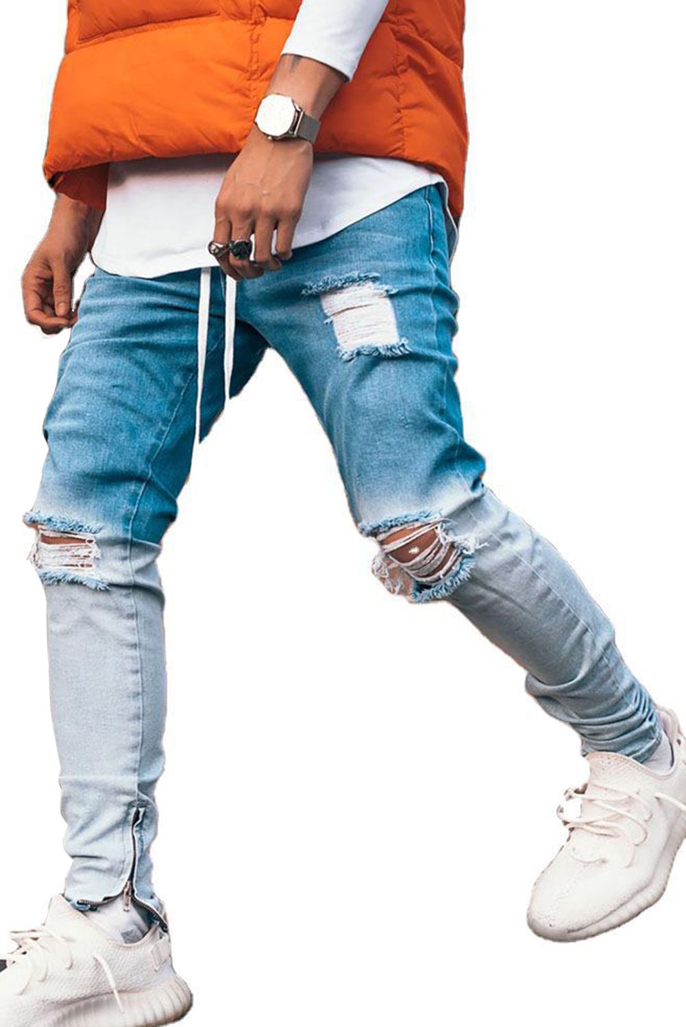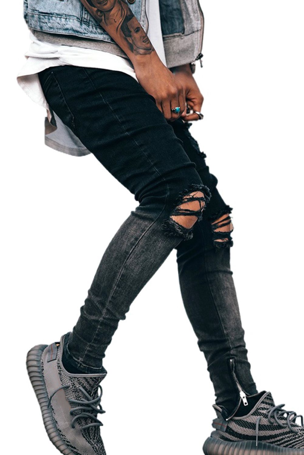 Black Gradient Color Zip-up Distressed Slim-fit Men's Jeans