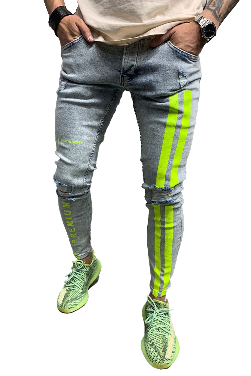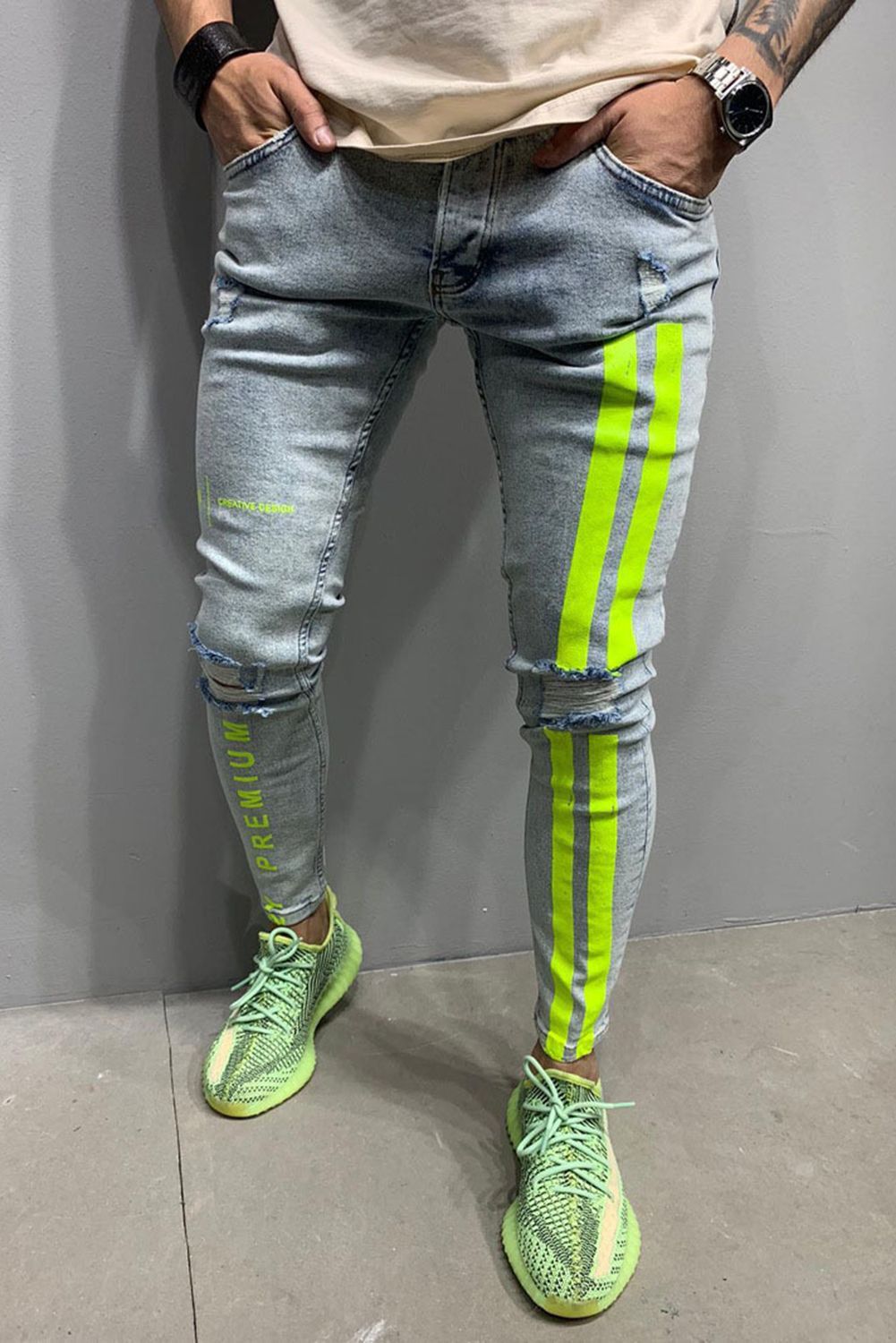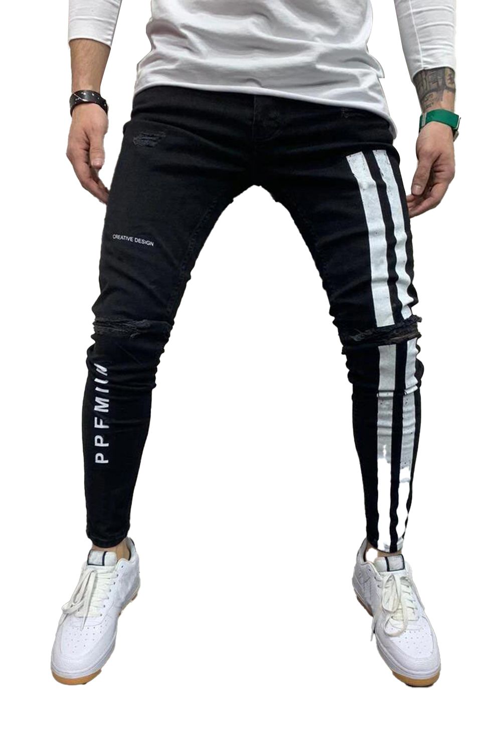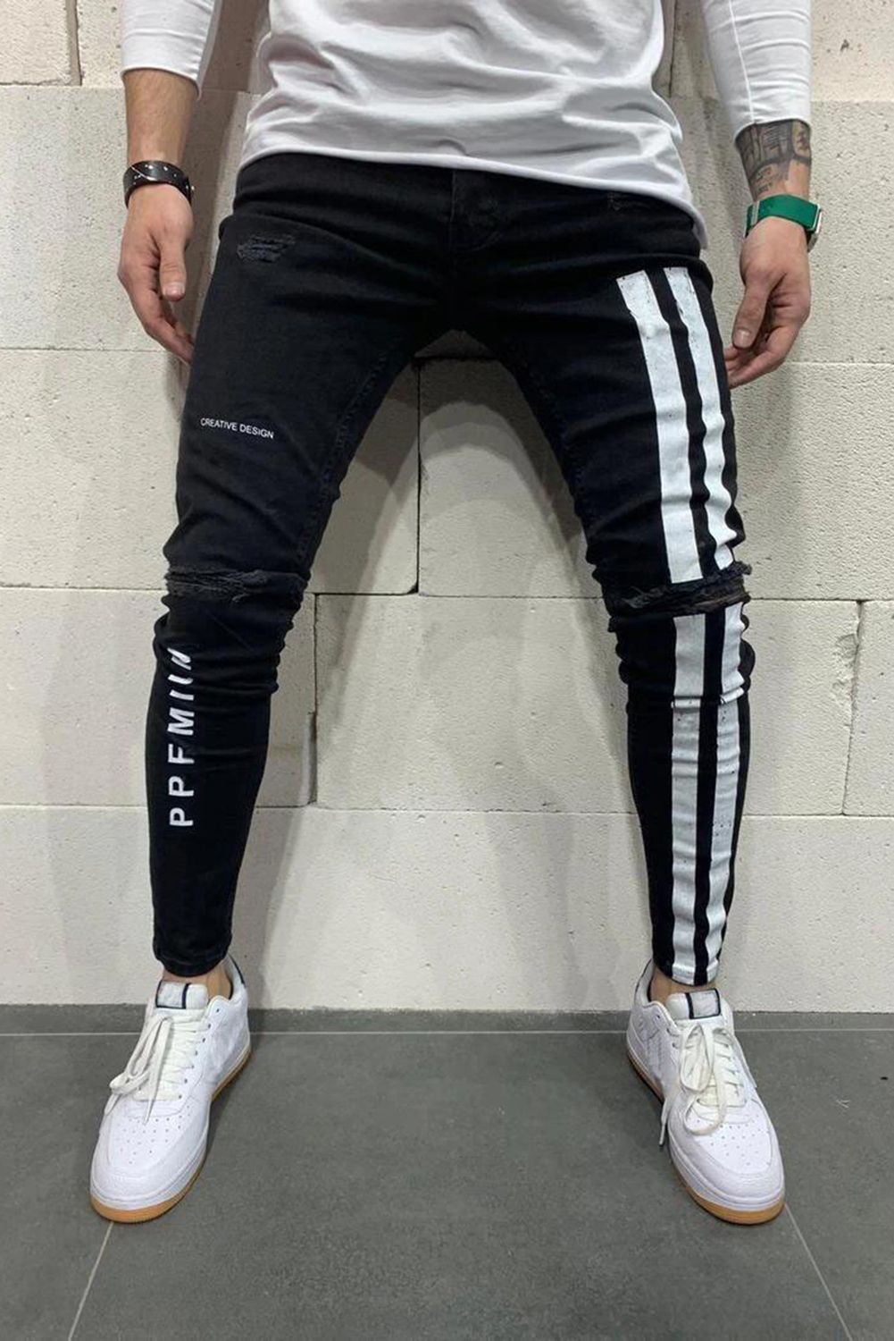 Black Men's Letter Striped Ripped Slim-fit Jeans