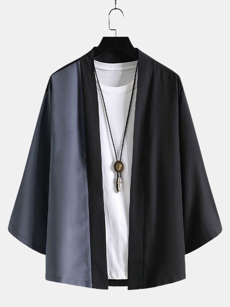 Mens Patchwork Open Front Loose Fit 3/4 Sleeve Kimono