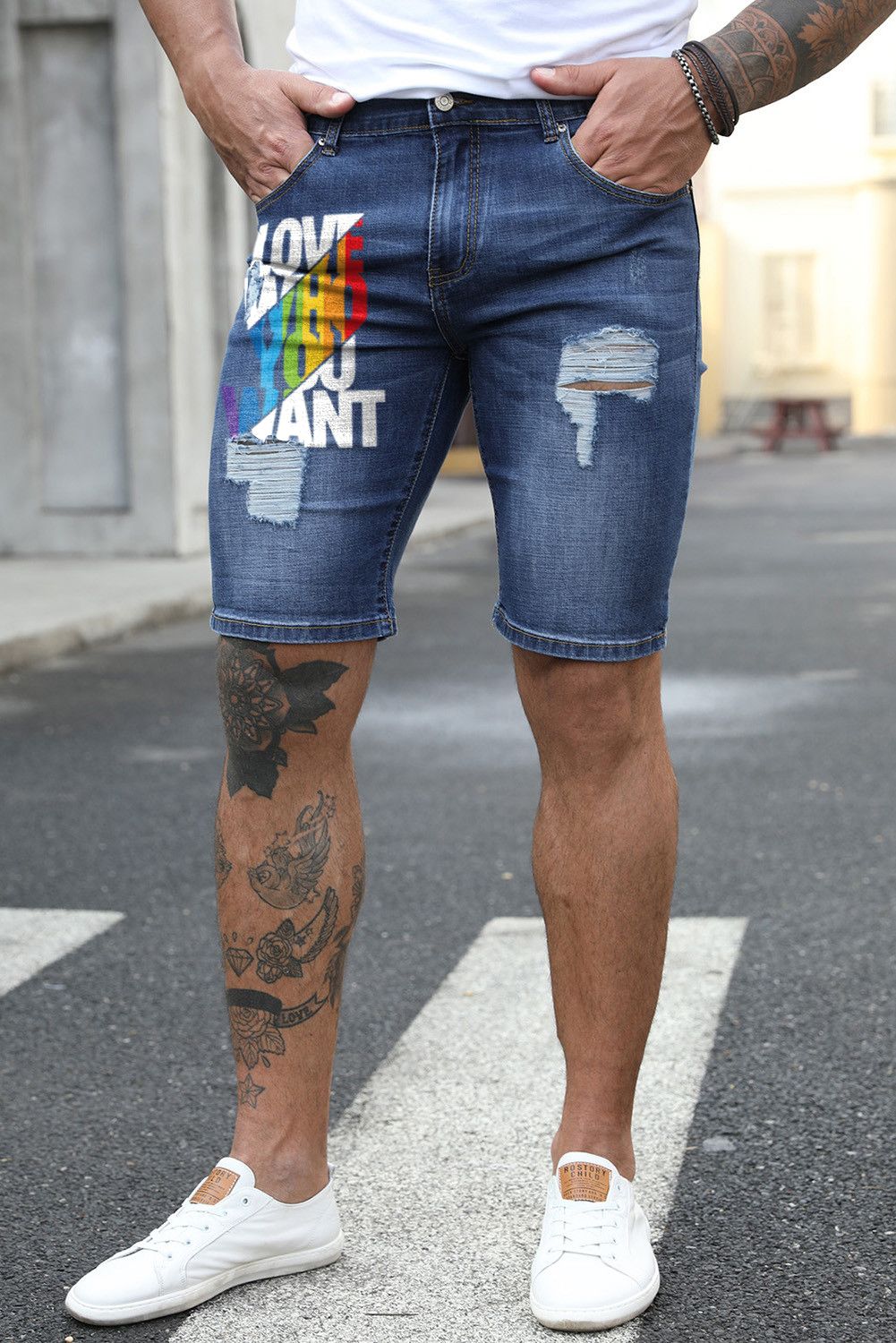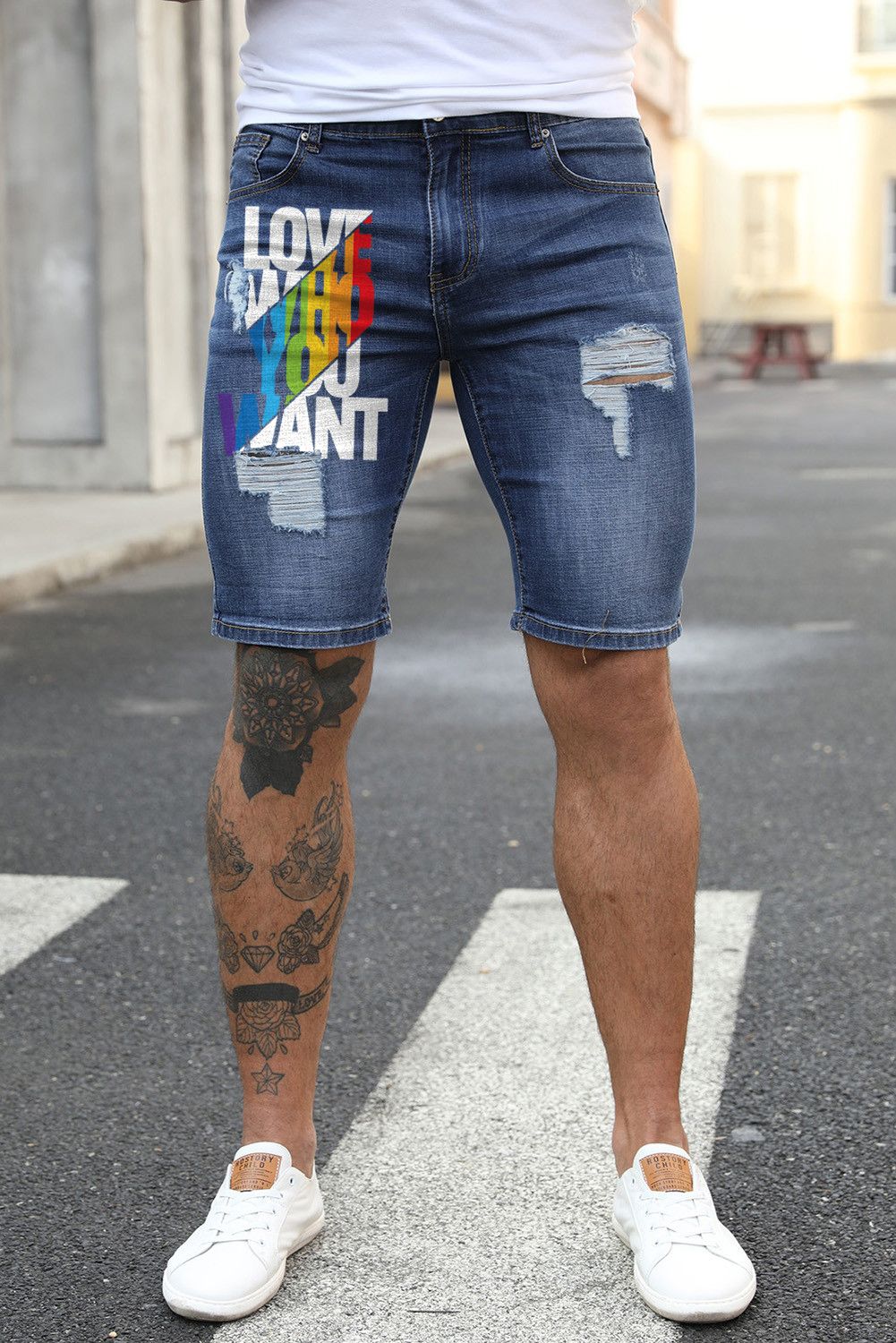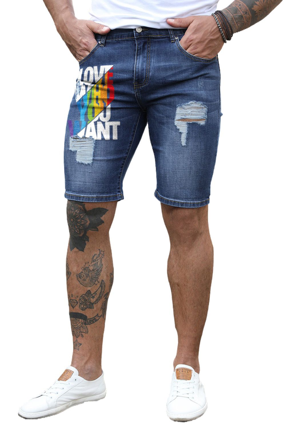 Blue Love Who You Want Print Men's Ripped Short Jeans