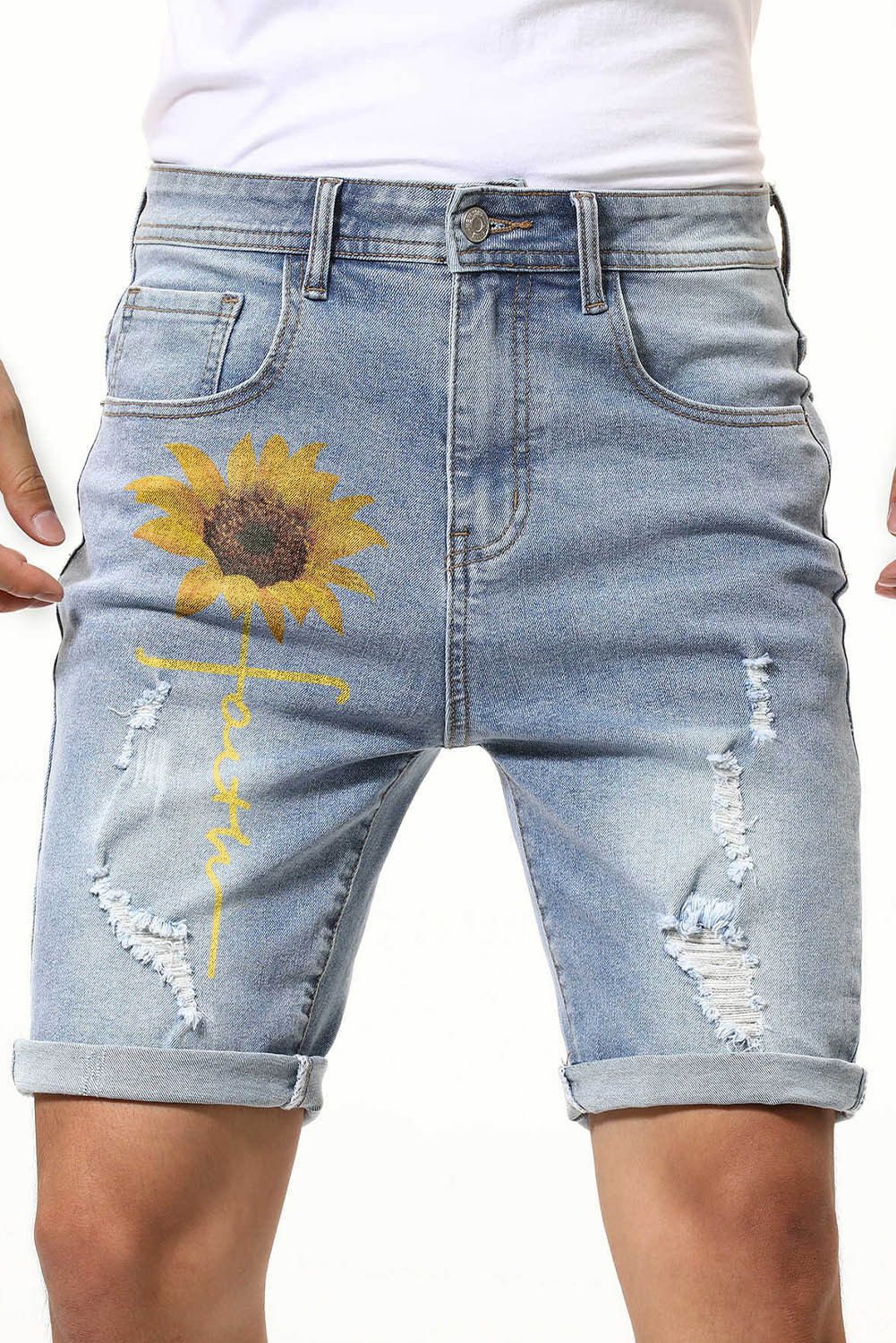 Sky Blue Sunflower Faith Print Ripped Bermuda Denim Shorts