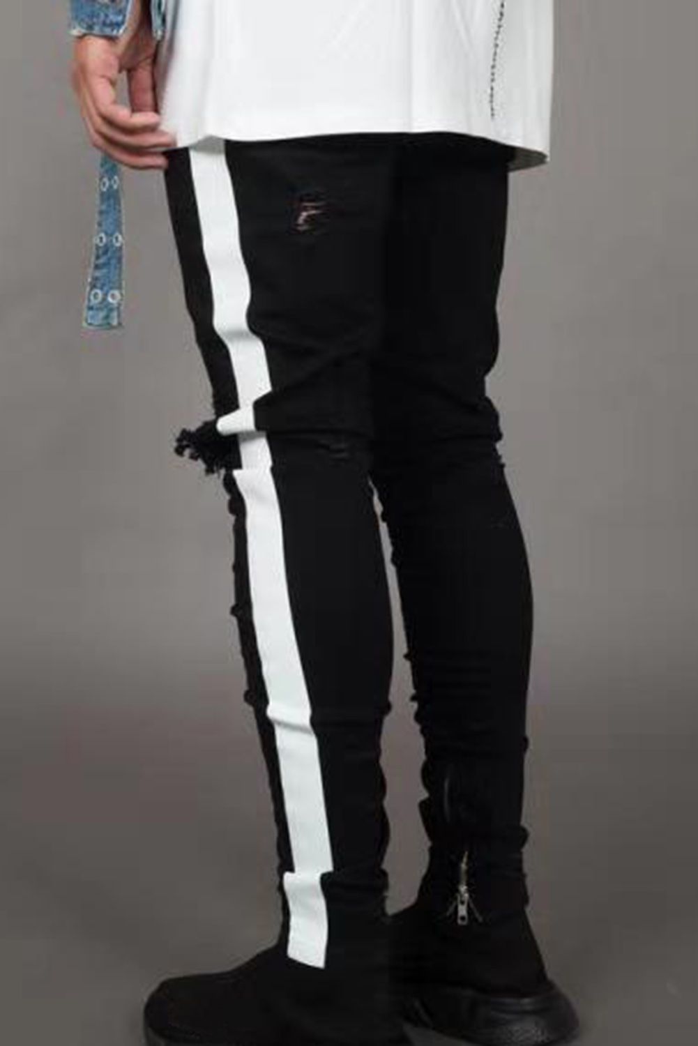 Black Letter Striped Print Ripped Slim-fit Men's Jeans