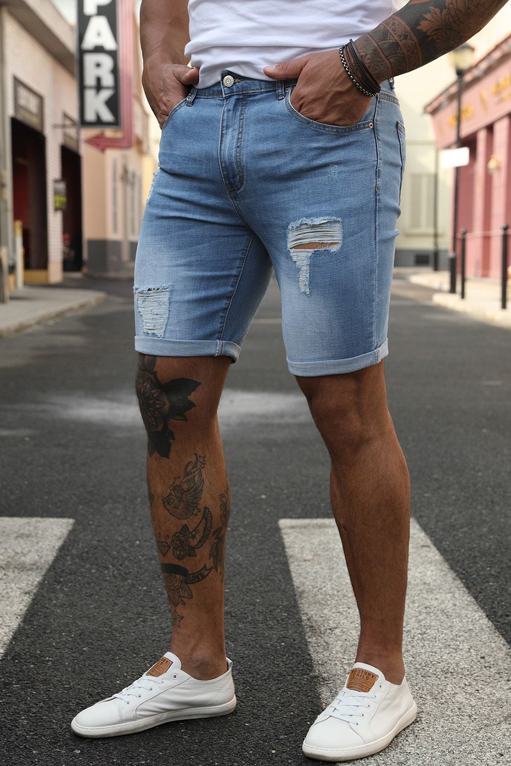 The distressed denim shorts will make the wearer stand out from the crowd