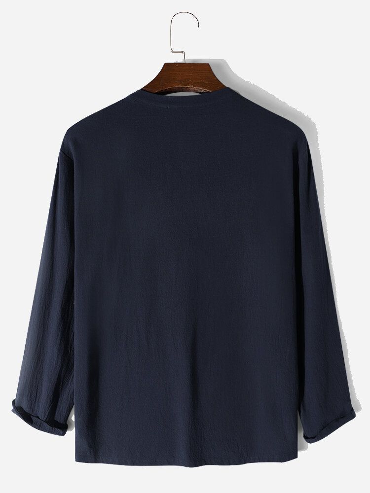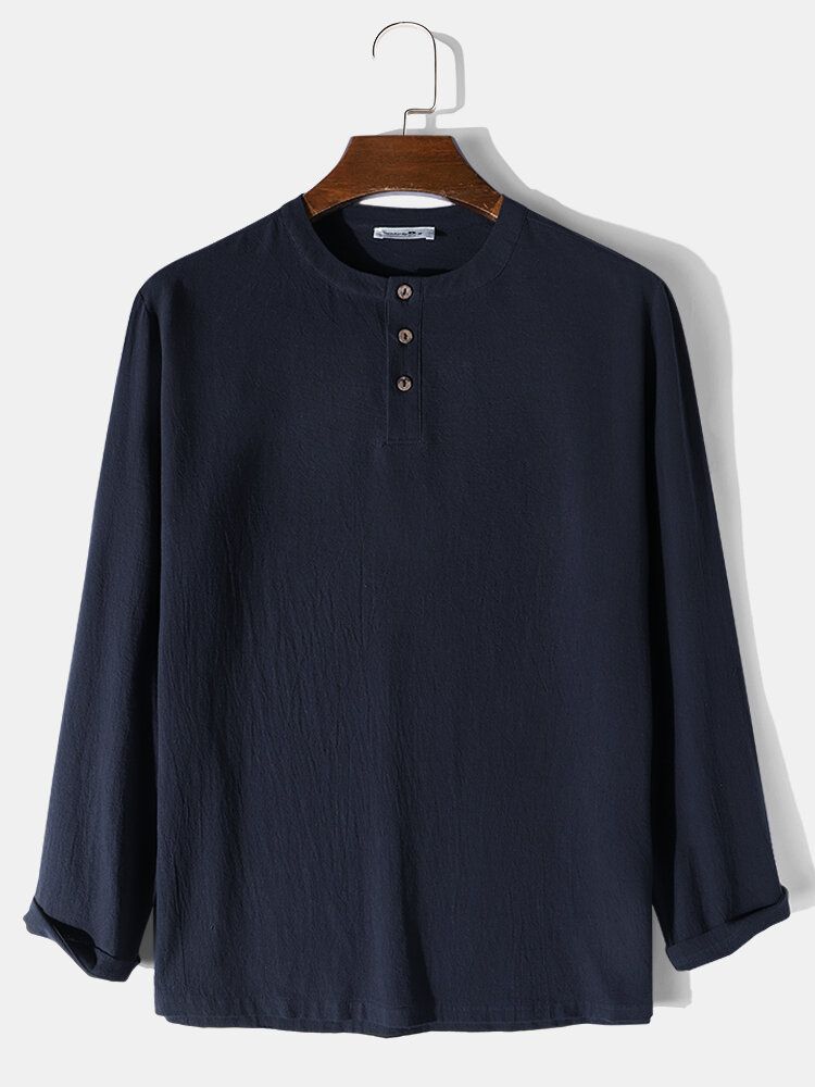 Mens Solid Color Texture Button Design Cotton Long Sleeve T-Shirts